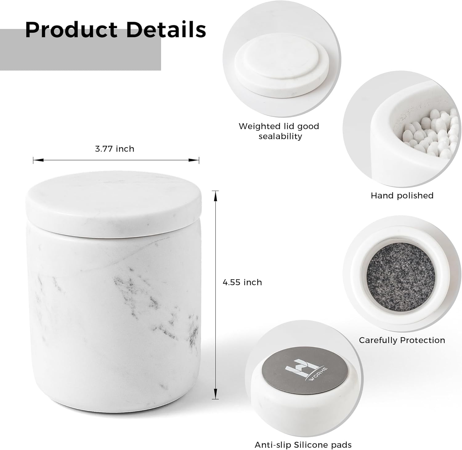 - Functional Design: Featuring a secure lid, WORHE marble canister keeps your essentials like cotton swabs and balls clean and dry. Non-slip pads on the bottom prevent sliding and protect your surfaces from scratches, making it perfect for bathroom countertops and vanity tables