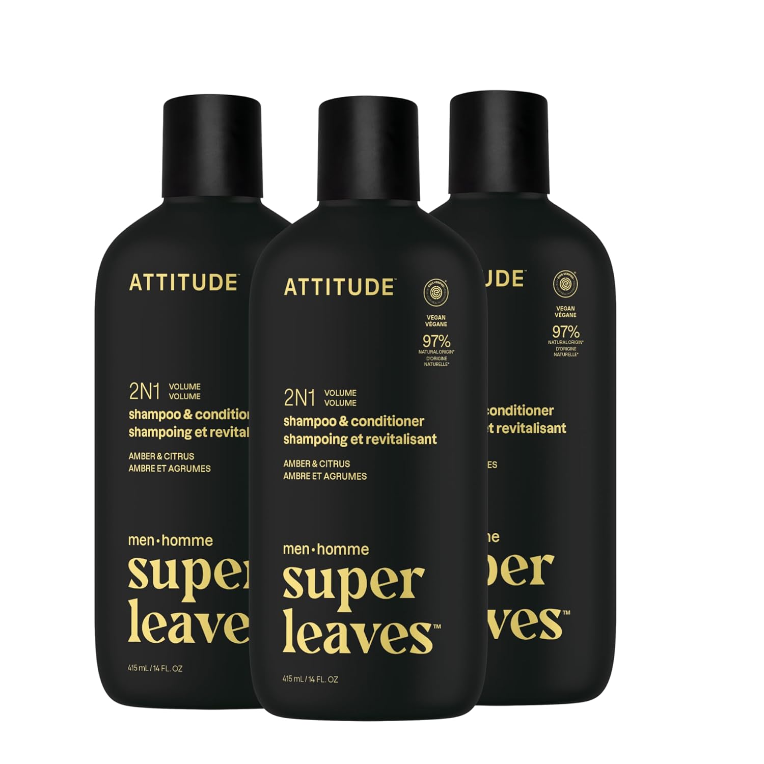 ATTITUDE Men's Shampoo and Conditioner 2-in-1, Volumizing for Thin Hair, With Rosemary and Rice Protein, 97% Natural Origin Ingredients, EWG Verified, Amber & Citrus, 14 Fl Oz (Pack of 3)